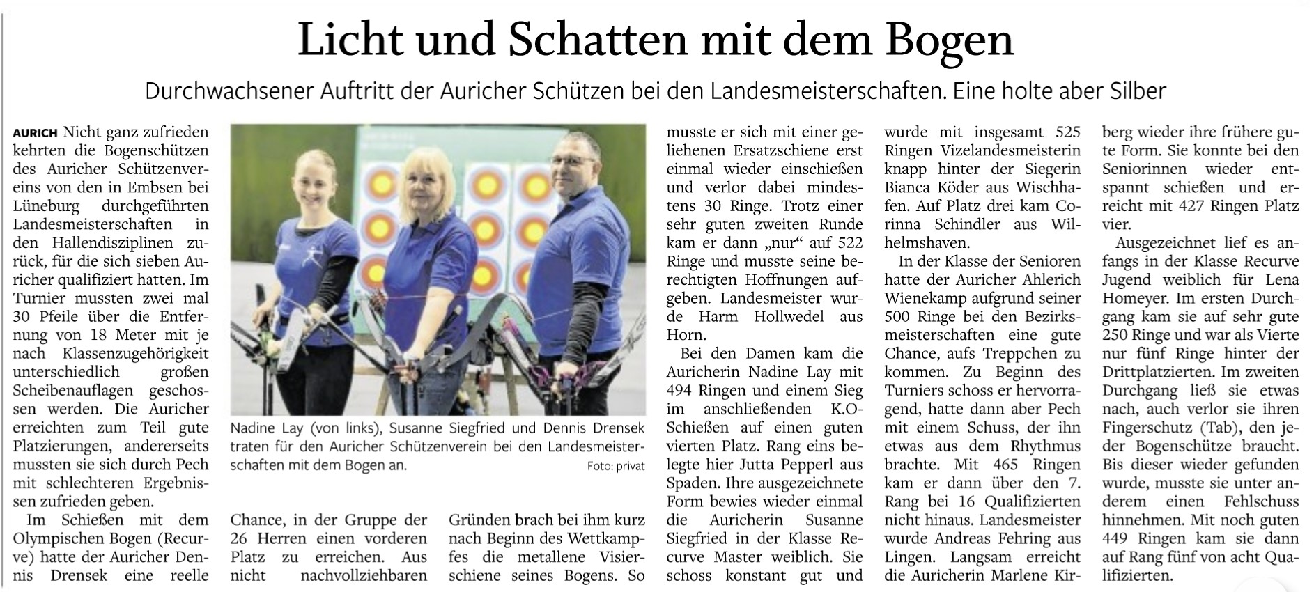 Die Bogenschützen des Auricher Schützenvereins konnten bei den Bezirksmeisterschaften Halle 2025, die wegen der dann späteren Outdoor-Saison bereits Anfang nächsten Jahres beendet sein müssen, mehrere Titel gewinnen.