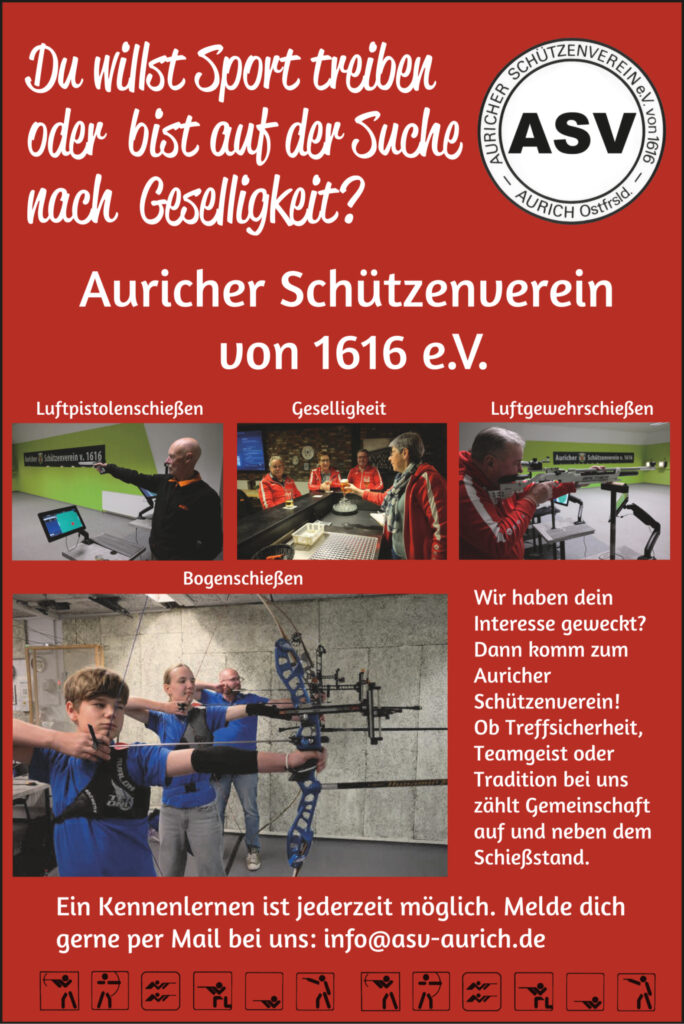 Der Auricher Schützenverein von 1616 (ASV) hat allen Grund, das diesjährige, 405. Schützenfest seiner Geschichte mit besonders großer Freude zu feiern. Die Schützen haben viel Geld und Eigenleistung investiert und innerhalb des Schützenhauses intensiv renoviert und umgebaut. Wer Lust hat, kann sich davon bei einem Besuch oder beim Schnupperschießen überzeugen.